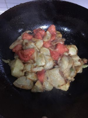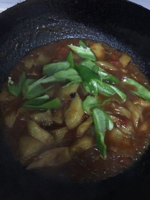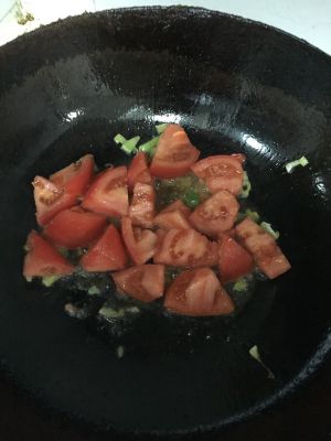 锅中留少量底油。(这里的油只要放一点点就可以了,因为炸锅的茄子已经有足够的油。)油热后放入葱花炝锅,然后放入西红柿翻炒。