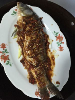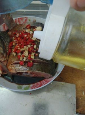 把剁椒铺在鱼身上,淋上蒸鱼豆豉油,再加点食用油。放锅里蒸。十几分钟就可以了。