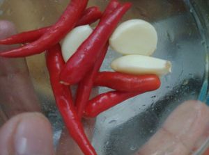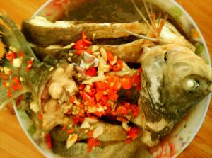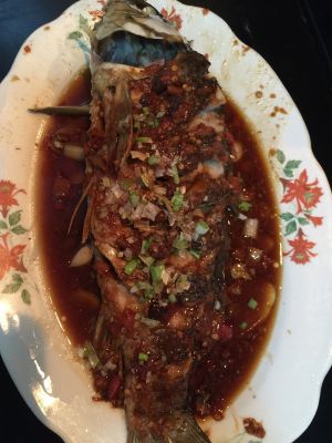 自制的剁椒酱,放上蒜粒、白砂糖拌匀,铺在鱼身上,放热水里蒸制10分钟。