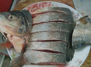 把鱼处理好,头跟尾切下来。鱼身切成条,但是不要完全切断哦。(如图)这样比较容易进味。在鱼身上摸上一层盐,鱼腹也摸点。