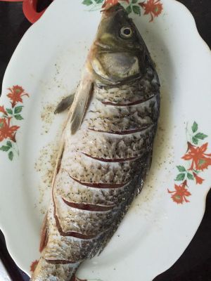 鱼剖好,划几刀。抹上盐,白胡椒,白酒。腌制十分钟后洗掉。
