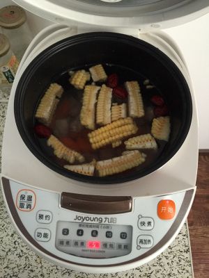 调到煲汤程序,等出锅时,放入盐和少许味精。PS:想更入味,在放入胡萝卜玉米半小时后加盐和少许醋