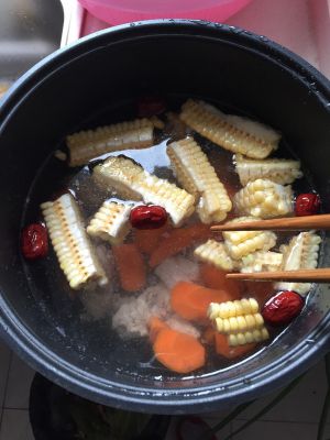 所有食材放入电饭煲,加水,红枣最后快熟了放(这是最简单的做法)。 PS:想味道更好就将排骨煮半小时后再放玉米和胡萝卜!