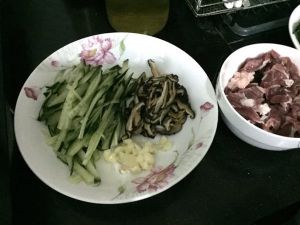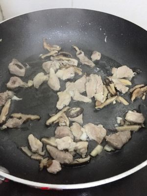 放蒜头起锅放香菇炒香放肉进去一起炒。肉熟了就放面了。放入面要小火翻炒,再放酱油耗油。最好用筷子炒。要炒均匀。差不多的时候放点黄瓜丝再炒几下就可以。
