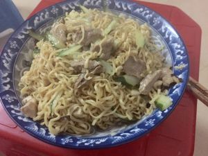 锅中倒入适量食用油,烧热后倒入辅料(可分开炒也可一起放进去)翻炒,差不多熟的时候倒入之前的面条,翻炒几下,倒入少量陈醋(依个人口味,沿锅淋入)和食盐,继续翻炒几下出锅