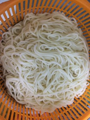 把鲜面条煮到8分熟,盛到框子里,用凉水冲一下,控下水,放几滴食用油拌一下,避免粘连。