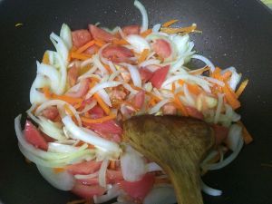加入洋葱、红椒、白菜。辣椒翻炒炒熟