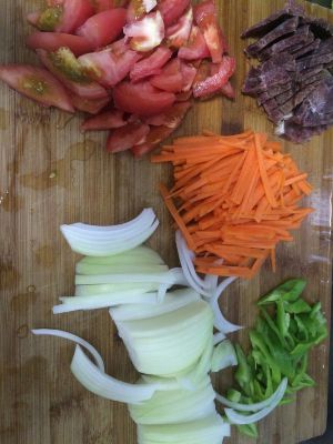材料总汇,先把胡萝卜和洋葱切丝,西红柿切小丁,牛肉切片,喜欢辣椒的朋友可以切点青椒。