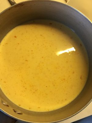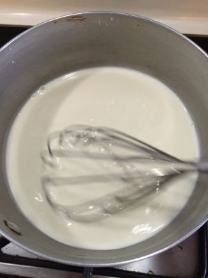 泡好的吉利丁3片,放奶锅里隔水融化。