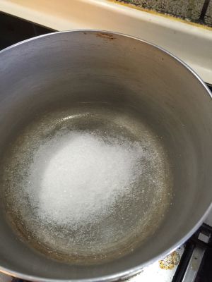 开火 用灶台的最小火 加热 边热边搅拌 白砂糖在稍温热时就会融化 如何判断呢?小拇指伸进锅里 感觉到温热了 但不烫手 就关火。放入软化好的吉利丁片 搅拌均匀。连锅一起放冷水里稍微拔一下 降降温