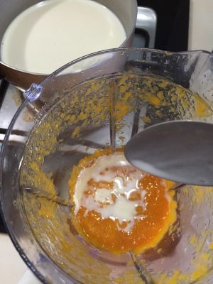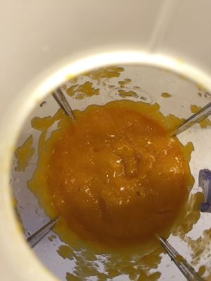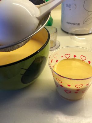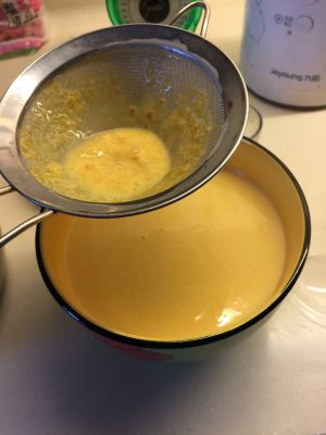 刚打好的芒果泥 太稠了 不好与牛奶液融合 可将冷却的牛奶液盛三勺 与芒果泥混合 这样就稀了