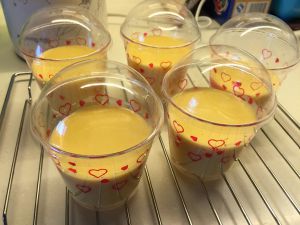 小火加热,等吉利丁片融化了就关火,搅拌均匀,布丁瓶都用开水烫一下。