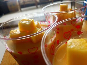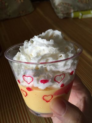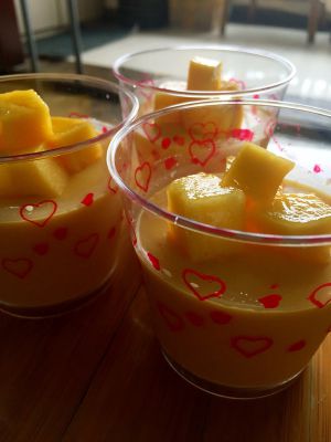 将摊凉的牛奶液加入芒果粒和淡奶油后,搅拌均匀后,加入将布丁的容器中,放入冰箱约3个小时即可.(此配方可同时放入4个大玻璃布丁瓶+6个小玻璃布丁瓶)