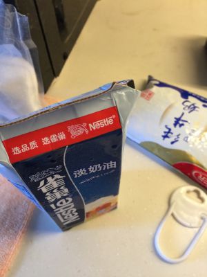 准备芒果果肉,淡奶油,糖小朵零卡糖15克。