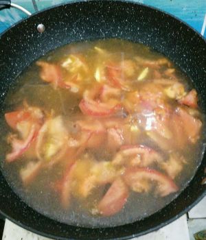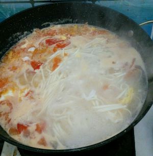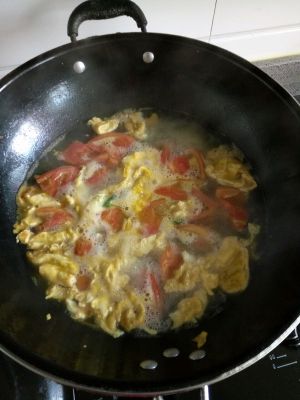 西红柿下锅,炒到出红汁,添加 鸡精、味精、盐,翻炒后加水。