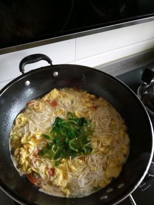 面煮好,浇上打好的鸡蛋,锅开放盐,胡椒粉,出锅