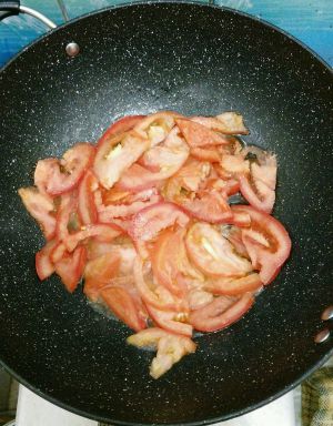 锅中放油,油热后加入切好的西红柿翻炒,炒出红亮的汁。