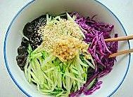 蒜泥加盐,生抽,醋,芝麻拌匀(喜欢辣的可以放些辣椒油)。浇在蕨根粉和黄瓜上,拌匀即可