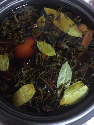 把压碎的鹌鹑蛋放入锅内,放八角、香叶、桂皮,倒入生抽、少许老抽(调色),加水没过鹌鹑蛋,开大火,煮沸后转小火,时间越长越入味,我喜欢烧2~3个小时后关火,第二天再用小火煮,这样比较入味,连蛋黄也有味。
