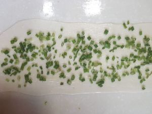 薄膜左右上下各划2刀,撒上葱花。