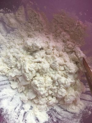 面粉加水开水,用筷子搅拌均匀后揉成不粘手的面团(不用追求光滑)