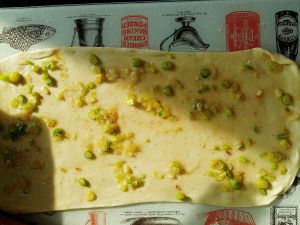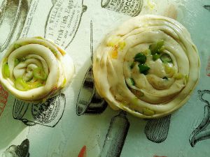 面已醒好,切好,擀平,把搅拌好的料抹匀,象包子一样包好,压平。锅里倒油,把饼子放入!