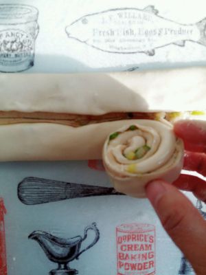 在上面涂上一层油,之前面粉里有放盐,在上面在抹少量,把炒好的芝麻,切好的葱段铺上