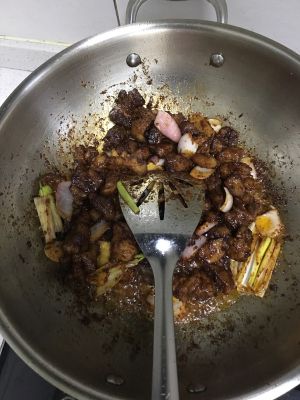 备菜:牛肉切块,胡萝卜、土豆切滚刀块,姜片,葱段,八角3个,冰糖7块,干辣椒2个,洋葱丝少许。