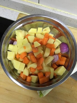 土豆胡萝卜切小块,葱头切成小段!备用!