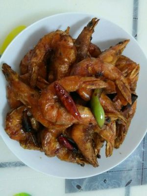 另起锅,倒入少许油,放葱姜蒜红辣椒煸炒,倒入炸好的虾,沿锅边倒入干煸四季豆剩下的料汁(酱油,盐,料酒,蚝油,糖和少许水)