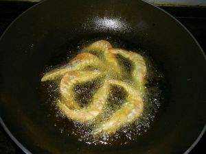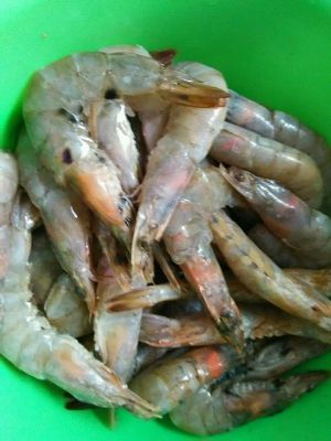 锅内倒入油,记得要多一些,比平日炒同样份量的荤菜油多一倍吧 大火烧油至辣,倒入虾。