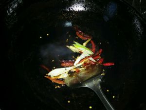 姜蒜香味炒出后,加入酱油适量,白砂糖适量,料酒少许 快要起锅时,放入葱丝,翻炒 加适量盐。