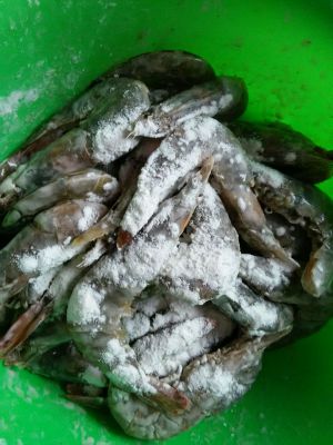 腌好的虾用干淀粉裹匀,这样虾出来的虾酥脆,形状好,可以直接食用