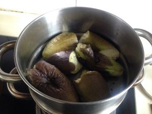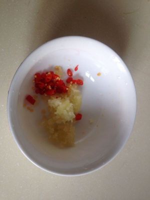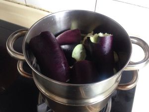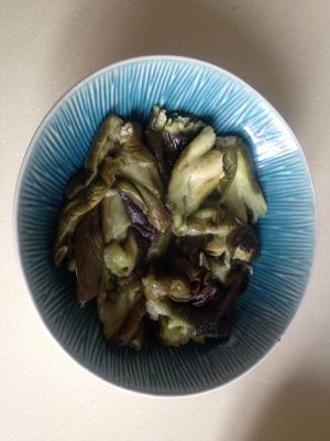1.先把茄子洗干净,在锅里蒸5-10分钟,然后用筷子拨开成条状。把青辣椒、蒜瓣、葱末切好,放入盘中。