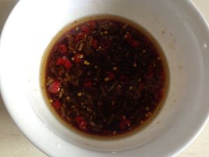 用一个小碗倒入适量的醋,蒸鱼豉油和少许的盐,鸡精,搅拌后浇在茄子上即可。