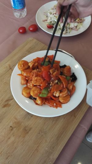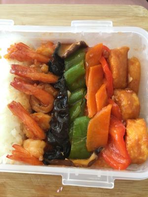 日本豆腐沾干淀粉油炸,虾仁过油成球,青红椒和胡萝卜,香菇过油。热油葱姜炝锅,倒入番茄沙司,加入白糖,白糖多放一些,煸炒片刻,加入眼和少许热水,把所有的菜倒进去翻炒,直到收汁,撒上蒜末,盛盘。这个过程其实挺快的,多放一些油,反而不费油,而且高温炸这些食材使得出菜速度很快的。几乎是一气呵成的完成。反而最耗时的是切菜啦。