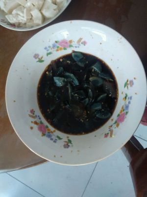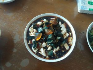 要上桌时把调料浸着的松花蛋一起倒在放着盘子的豆腐上~别搅拌~这就OK啦~用勺子吃~凉凉的很棒呢~好吃~