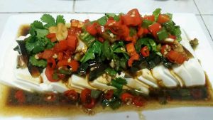 在豆腐上玛上皮蛋丁,榨菜末,小葱末。加三小勺生抽,一小勺红油,两勺香油,就行了。因为加了榨菜末,不用盐咸味儿就够了……而且加了榨菜末还有一种脆脆的口感……