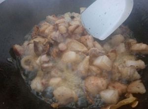 放入老抽一勺,生抽一勺,放入土豆,炒变色