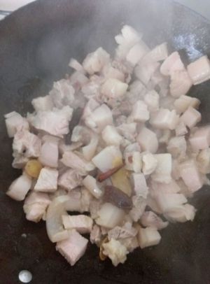 热锅放油,放入大料冰糖或砂糖,炒出香味后,放入焯好的肉,炒至两面稍有金黄