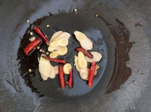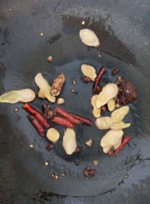油少许,五花肉有油,所以这里油能沾个锅底就行,生姜下锅爆香。