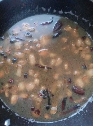 加入料酒,八角,辣椒干和水(水要泡过肉面)