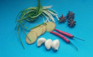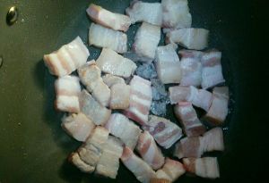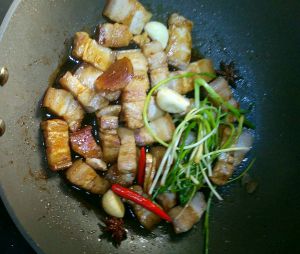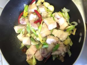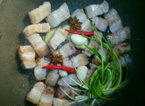 五花肉煸出油下葱、姜、蒜、辣椒八角,倒入料酒。
