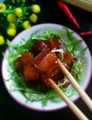 3 锅底下少许油,待油微热放入3勺糖,不断搅拌锅底至糖色成淡褐色(注意要用小火,不然烧的过焦会发苦),马上下入五花肉翻炒,上色均匀狗加入少许盐,不要放太多,加入料酒和适量水闷至柔熟透(时间充裕的话可以选择不放水,开锅后关小火闷煮30分钟,这样更好吃),收汁,要见油不见水,把肉翻炒一下,色泽更亮,盛盘(用了两道控油,吃起来写好也不腻)