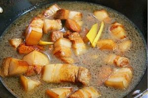 锅热放适量油,放八角桂皮爆香再放入五花肉加入酱油炒至两门微黄,这样的话五花肉香而不油腻。加热水盖过五花肉再加冰糖生姜大火烧开后改小火慢炖50分钟。