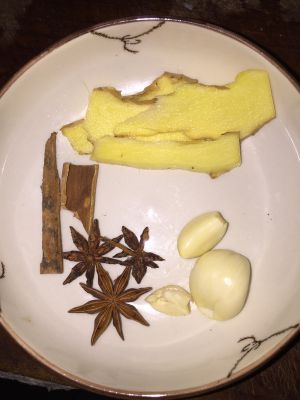 姜切片,剥几粒大蒜籽,桂皮少许,八角少许