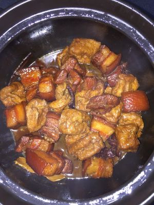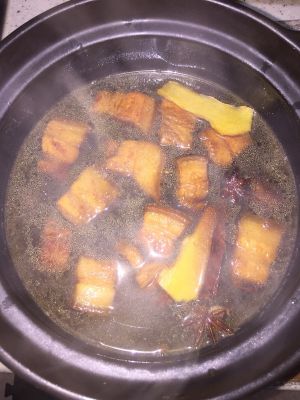 然后加入开水,开水要完全浸没肉,尽量多点,大火烧开转中小火,炖大约1个半小时就差不多了,快到时间一定要看着防止水少糊锅!看到汤浓稠的时候加入盐调味翻炒均匀关火!此时一道美味的红烧肉就做好了!