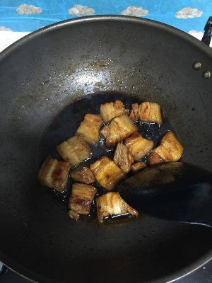 再倒回五花肉翻炒,让五花肉均匀上色。
