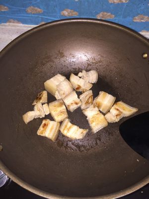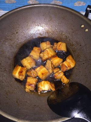 起一口干净的锅,倒少许底油将五花肉块倒入锅内煸出油,煸过油的肉捞出,留稍许油在锅内