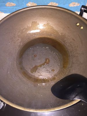 留底油,加入8g冰糖,小火炒至冰糖融化呈焦糖色。